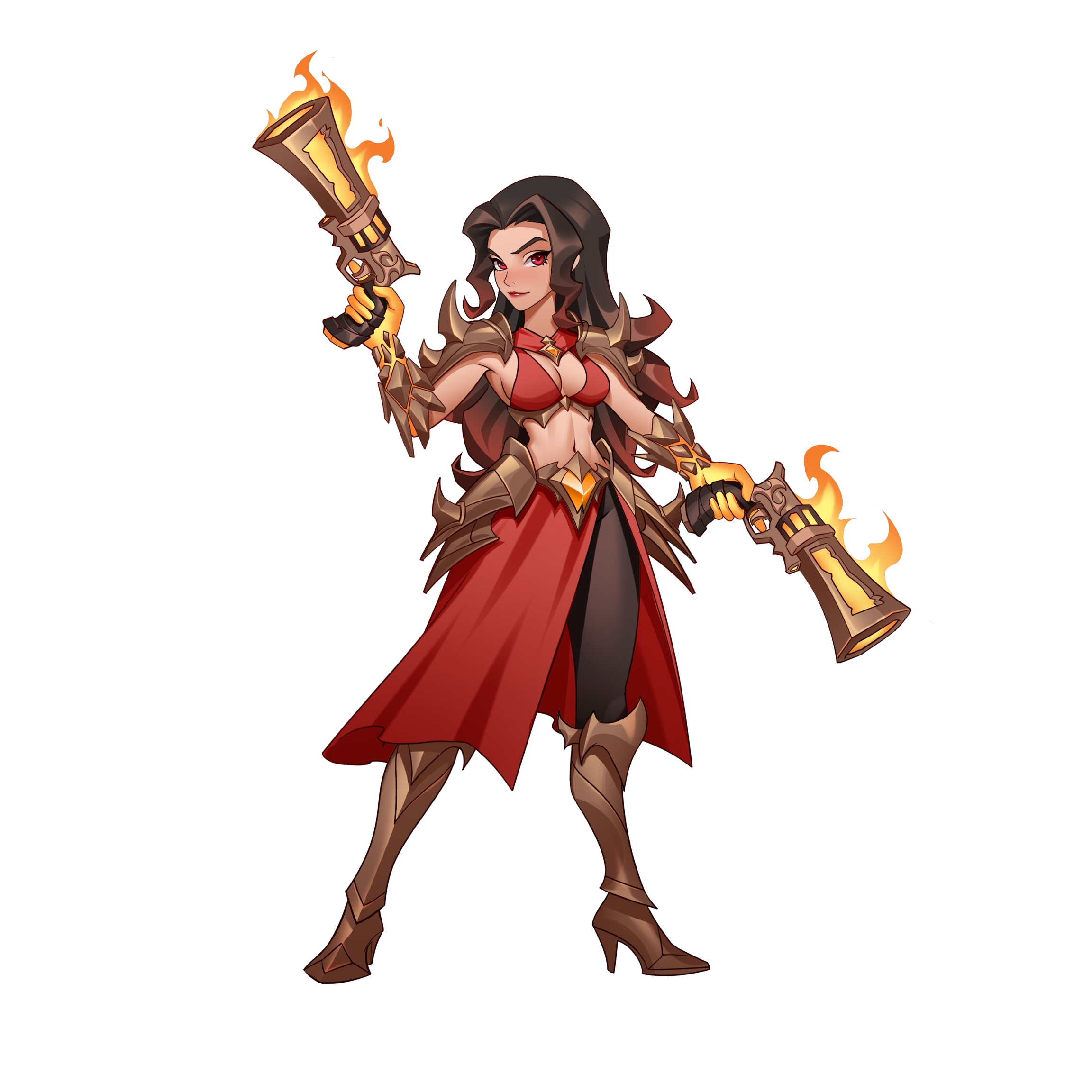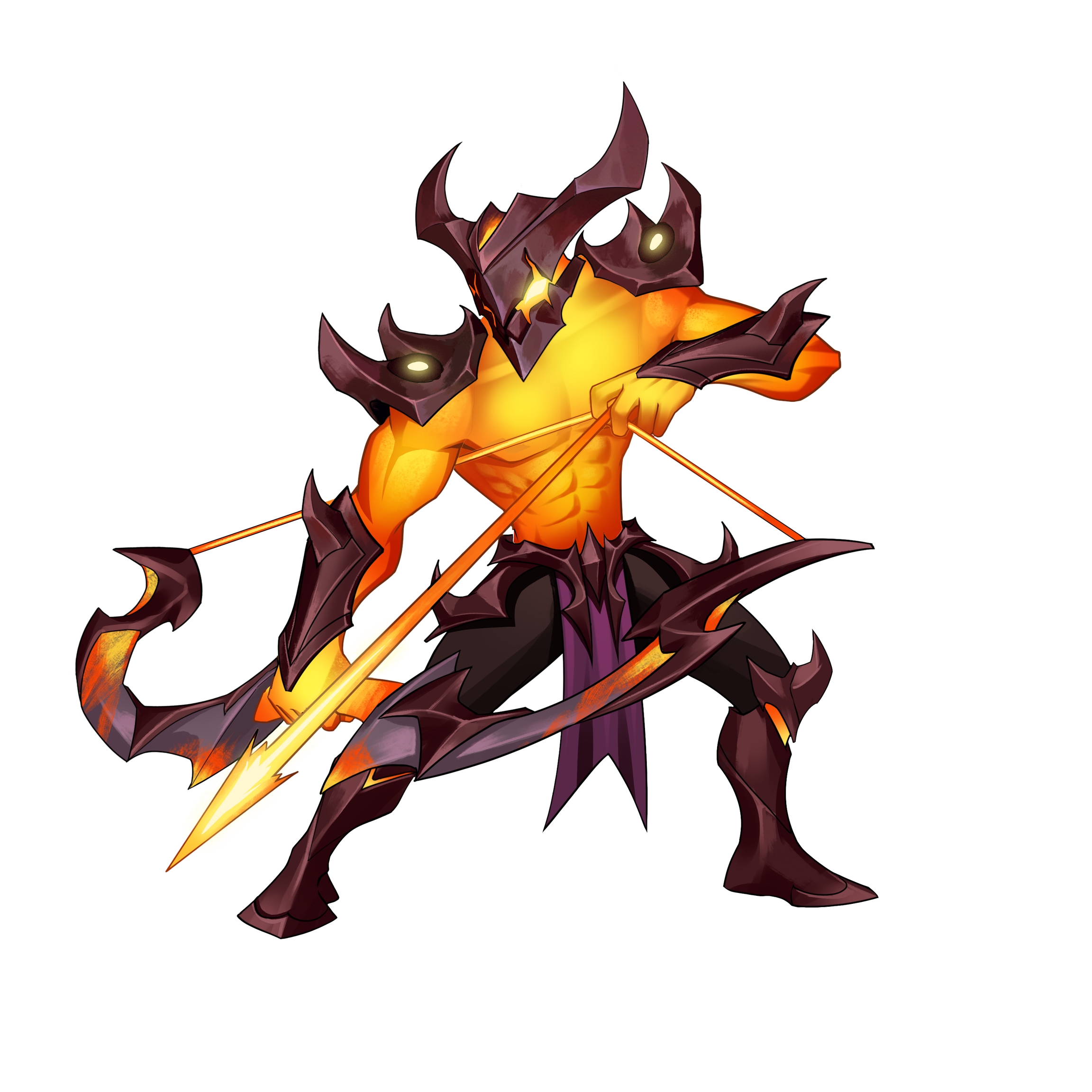 Sua principal arma é um grande arco feito de um metal especial, não apenas uma ferramenta de caça, mas também um símbolo de sua coexistência harmoniosa com o mar de magma. O Ranger do Inferno pode extrair elementos do magma para formar flechas ardentes, cada disparo é preciso e letal.